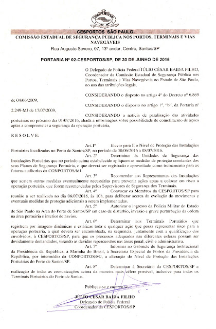 O Coordenador da Comissão Estadual de Segurança Pública nos Portos, Terminais e Vias Navegáveis do Estado de São Paulo (CESPORTOS/SP), delegado Júlio César Baida Filho, elevou o Nível de Proteção das instalações portuárias localizadas no Porto de Santos, litoral de São Paulo, para o Nível 2.