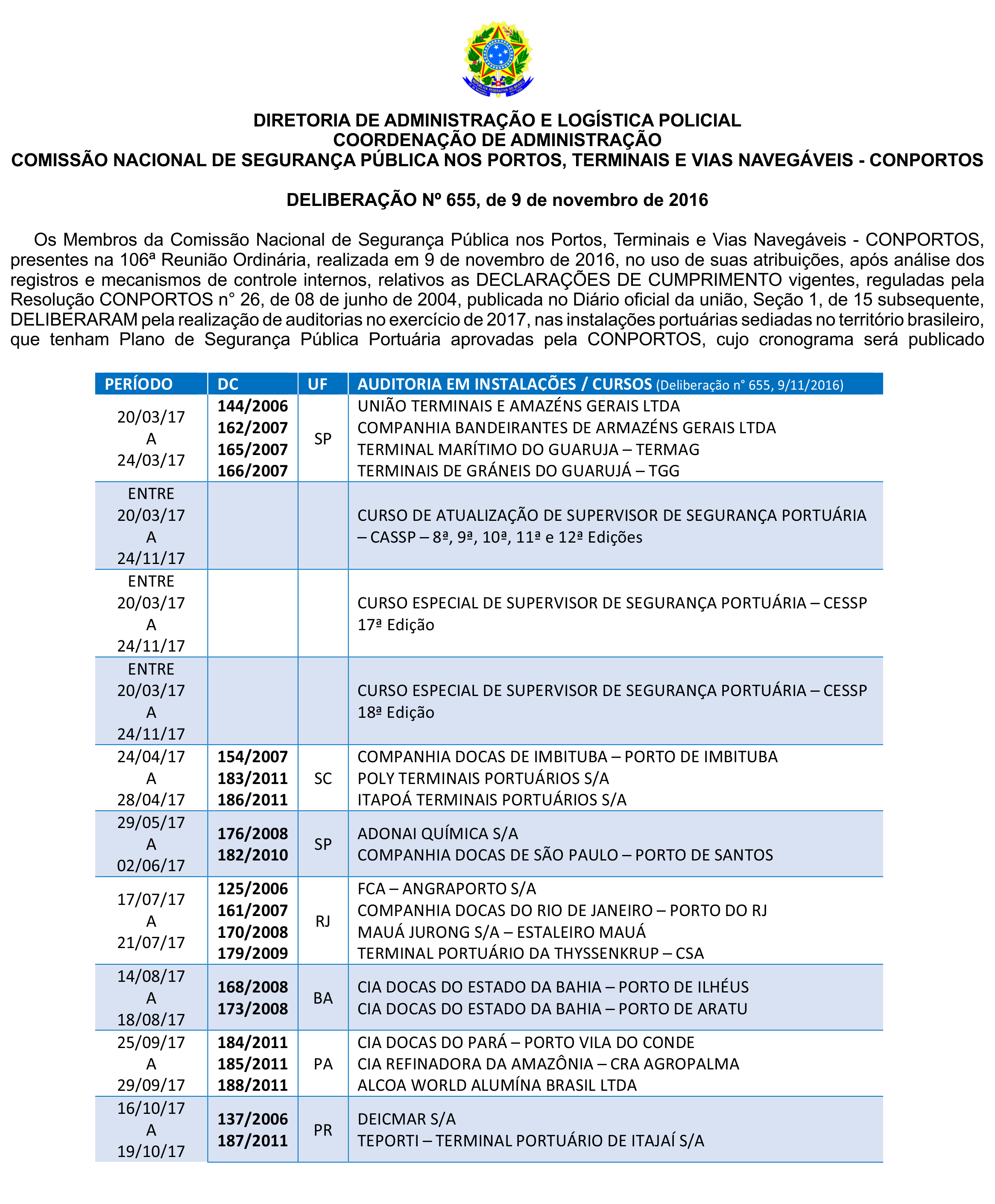 CONPORTOS publica Deliberação n° 655, de 9 de novembro de 2016 com o cronograma de Auditorias e Cursos para 2017.