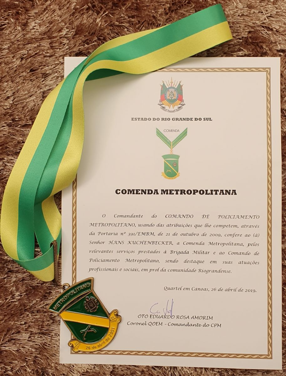 Ontem a noite recebi do Comandante do COMANDO DE POLICIAMENTO METROPOLITANO (CPM) a Comenda Metropolitana, pelos relevantes serviços prestados à Brigada Militar e ao CPM, sendo destaque em atuações profissionais e sociais, em prol da comunidade Riograndense.